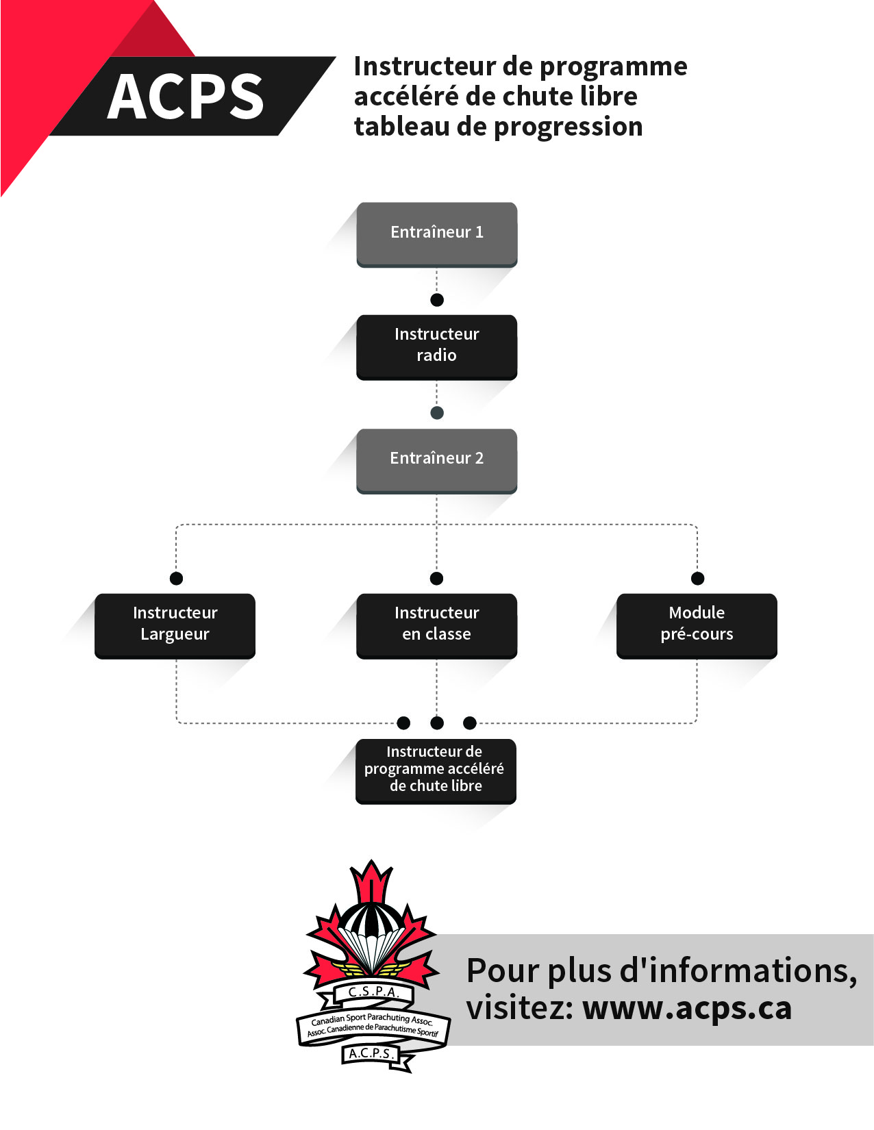 Cet entraînement se fera lors d’une session de formation tenue à un centre de parachutisme de l’ACPS sous la gouverne d’un responsable qualifié. Les préalables pour cette formation consisteront à détenir une des certifications suivantes : entraîneur 2 (E2), instructeur largueur (IL) ou instructeur en classe (IC). Les candidats ont la possibilité de compléter un module de pré-cours s'ils ne sont pas un IL ou un IC (contacter DC_IPAC directement). À la suite de la session, la composante « côté pratique » pour l’instructeur PAC consistera à sauter avec des élèves parachutistes dans le rôle de l’IPAC.